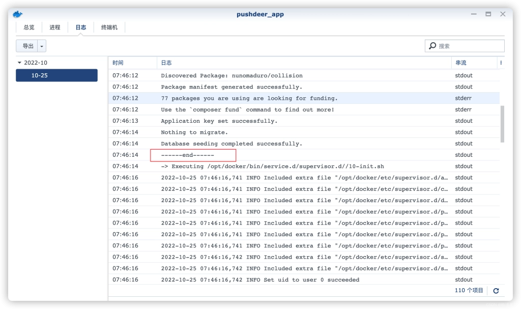 5. 坐等创建 docker,会创建三个 docker,一个是数据库,一个是 pushdeer,一个是 redis,可以通过群晖 docker 等三个 docker 都创建完,查看 pushdeer-app 的 docker 日志,等到显示 end 即可完成
