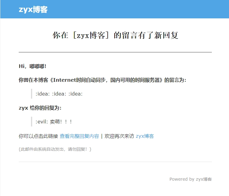 前段时间 zyx 博客启用了评论邮件回复功能,用了一段时间还算稳定,分享给朋友们也可以试一下!网上关于此类教程很多很多,实用的很少,要么是非常简约,让初学者自己一脸懵,我也是捣鼓了好久才配置好。