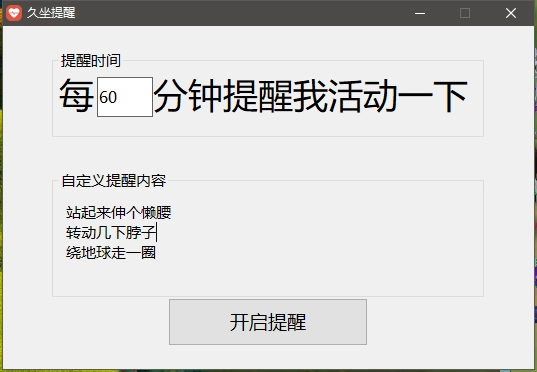 这个小工具叫久坐提醒,你自己设定一个时间,到时间会提醒你起来动一动,脖子扭一扭。